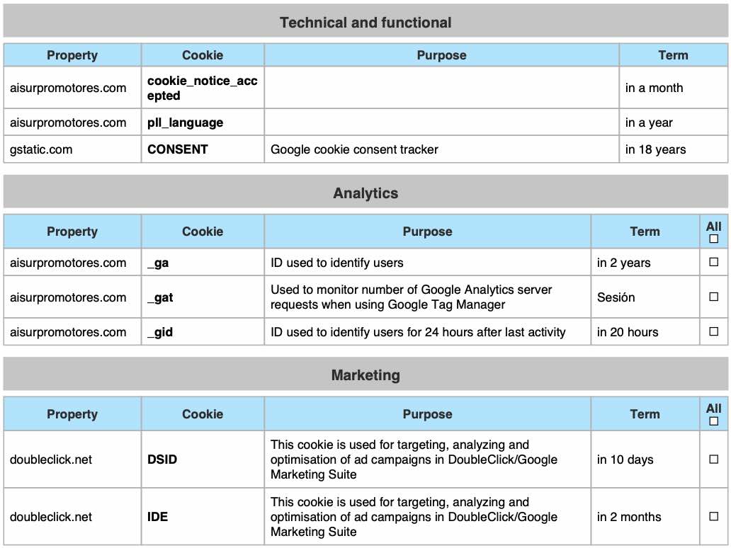 From this panel you can configure the cookies that the website can install in your browser, except for the technical or functional cookies that are necessary for navigation and the use of the different options or services offered.